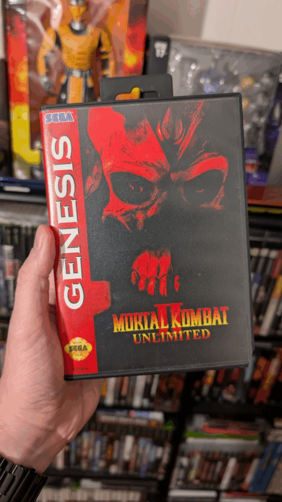 “Here’s a high quality homebrew cart of MKII Unlimited, an unofficial hack for the Genesis port of MKII by “Smoke”. This hack added the secret fighters, the bosses, running, as well as combos to the game. It’s jank but I love the charm. This copy was a gift from @UMKShock many years ago at one of the first
